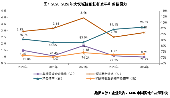 大悦城控股融资渠道相对畅通叠加期内偿债压力尚可,全年筹资性现金流净流出收窄至93.14亿(去年同期:243.29亿),在经营性、投资性现金流净流入规模同比下滑的情况下,在手现金较年初减少10%至271亿。若扣除披露的受限制现金余额后,可动用现金171亿,非受限现金短债比从年初的1.07下滑至0.98倍,需留意其流动性风险。此外,企业扣预资产负债率72.9%,净负债率96%。