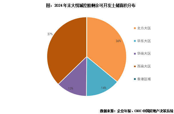 截止2024年末,大悦城控股剩余可开发计容建筑面积2821.6万方,较年初下滑15.9%。从剩余可开发建面分布来看,西南占比最高达37%、北方其次占比36%,剩余华东和华南占比约13-14%左右。