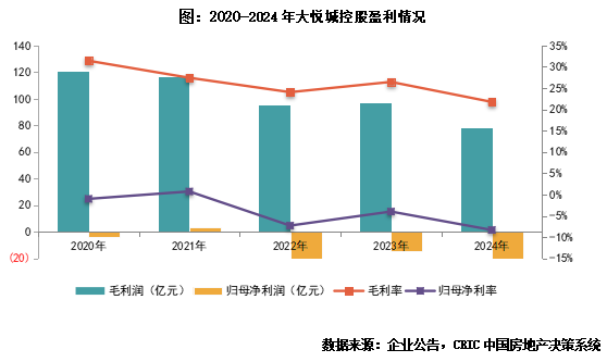 【合同负债/开发结转收入不足1,归母净利连续3年亏损】2024年大悦城控股物业开发结转收入283.9亿,同比微降2.3%,降幅较2023年(-13.3%)收窄,可能缘于年内并表比例有所上升。2024年开发项目全口径结算金额393亿元,对应并表比例约72%(去年:44.5%)。合同负债较年初下滑21%至250亿,对物业开发结转收入的覆盖倍数0.88(去年:1.09),结转资源有所不足。毛利同比减少20%至77.9亿,受合联营投资亏损扩大至21.9亿的影响,净利亏损25.6亿元,归母净利亏损扩大至29.8亿。