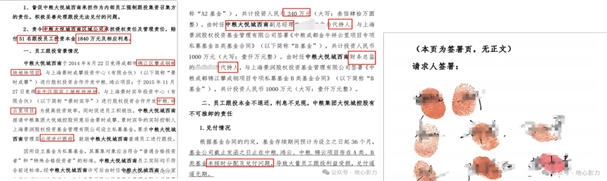 早在2015年,中粮大悦城控股西南区域公司要求员工参与两个内部项目的“跟投”,按照正常流程应该在2018 年售罄前后,员工可以拿回本金和分红。但实际上,直到现在员工不仅没有利息,也没有拿回本金。于是,51名离职员工联名签字、按手印控诉十年讨债无门。