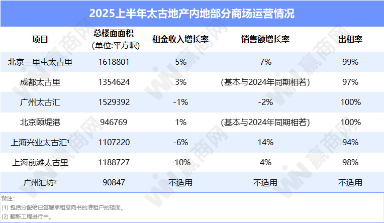 2025上半年,太古地产内地零售物业租金收入上升2%至22.7亿港元;应占零售销售额(不包括汽车零售商的销售)上升1%,且较2019年同期(疫情前)高出70%。
