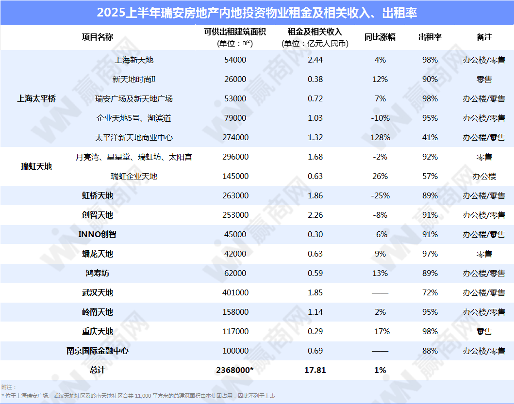 2025上半年,瑞安房地产租金及相关收入(包括自合营和联营公司)总额达17.81亿元,按年增长1%。其中,78%的租金收入来自上海的物业组合。期内,零售物业平均出租率达到94%,销售额、客流量均有达10.5%的双位数增长。