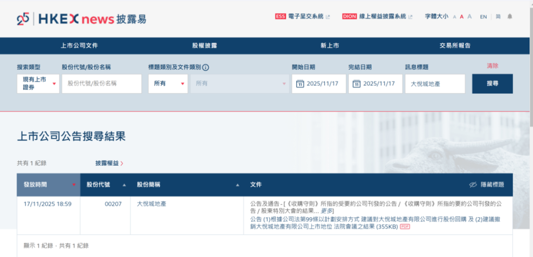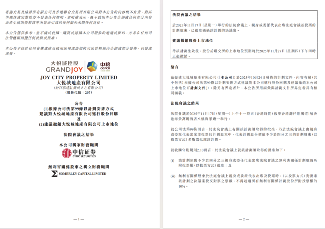 2025年11月17日晚,大悦城地产(00207.HK)在港交所发布公告,宣布公司私有化方案获得计划股东高票通过。出席法院会议并投票的28.11亿股股份中,99.32%支持退市决议,标志着这家在香港上市多年的商业地产企业即将告别资本市场。