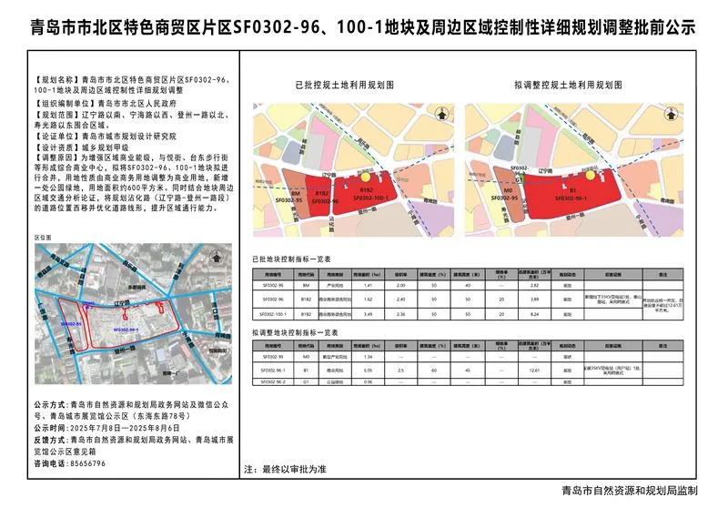 一个可以佐证的信息是,最新成交的地块原为青岛市市北区特色商贸片区SF0302-96、100-1号。今年7月, 青岛市自然资源和规划局 发布的规划调整批前公示显示,两宗地块拟合并为SF0302-96-1号、SF0302-96-2号。