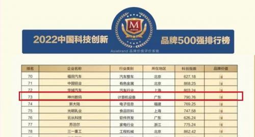 近日,“2022品牌强国论坛暨2022中国科技创新品牌500强发布会”在海南文昌隆重举行。专业品牌评价机构Asiabrand联合中国亚洲经济发展协会、亚洲品牌网共同发布“2022中国科技创新品牌500强”榜单。凭借不遗余力推动数字化转型、践行自主创新的品牌积累和较高的科创指数,神州数码位列榜单第73位,品牌价值再获业界权威机构认可。
