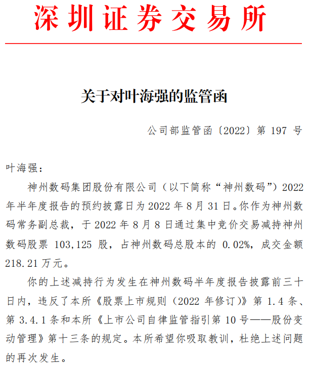 监管函内容显示,叶海强于2022年8月8日通过集中竞价交易减持神州数码股票103125股,占神州数码总股本的0.02%,成交金额218.21万元,而神州数码2022年半年度报告的预约披露日为2022年8月31日。