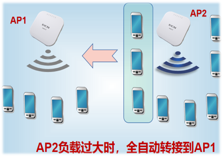 DCN无线控制器可实时的根据用户数和流量将接入终端调整分配到不同的接入点,平衡负载压力,极大的提高无线网络的容量和链接可用性。同时在频段或AP之间可实现自动负载均衡,提升无线接入质量。