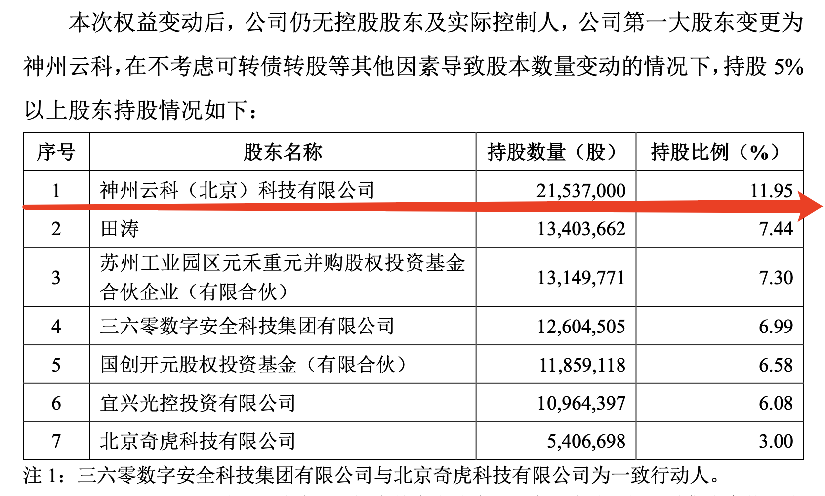 根据2022年三季报显示,山石网科第一大股东为越超高科,持有上市公司3052.29万股,占上市公司总股本的16.94%。此次交易完成后,越超高科仍将持有山石网科898.59股,占后者总股本的4.99%;神州云科将持有山石网科2153.7万股,占上市公司总股本的11.95%。届时,山石网科第一大股东将由越超高科变更为神州云科,该上市公司仍无控股股东及实际控制人。