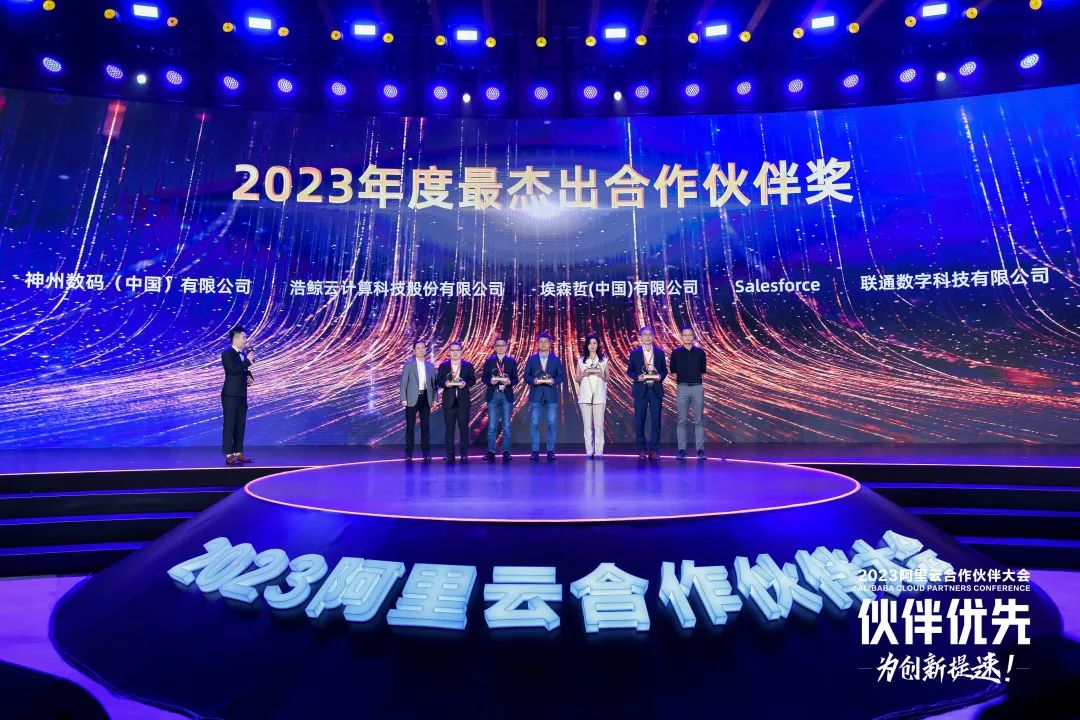 本次大会上,阿里云还隆重颁发了2023年度最杰出合作伙伴奖。该奖项是阿里云为年度优秀合作伙伴颁发的公司级奖项,旨在表彰与阿里云保持长期稳定合作,并在市场拓展、行业区域深耕、产品技术创新、客户服务等领域取得卓越成就的伙伴。神州数码副总裁、企业云业务集团总裁吴昊受邀出席颁奖环节,并发表重要讲话。