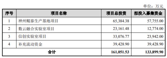 神州数码2023年8月25日披露向不特定对象发行可转换公司债券募集说明书(上会稿),公司本次向不特定对象发行可转换公司债券拟募集资金总额不超过133,899.90万元(含),扣除发行费用后,募集资金拟投资于神州鲲泰生产基地项目、数云融合实验室项目、信创实验室项目、补充流动资金。