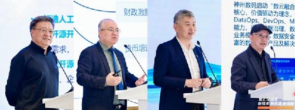 (从左至右分别为:中国工程院院士、鹏城实验室主任高文,大成基金副总经理兼首席经济学家姚余栋,全国政协委员、南方科技大学副校长金李,神州数码副总裁、技术总监李刚)