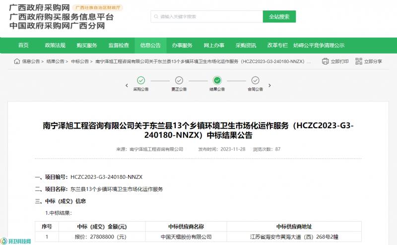 环卫科技网讯,11月28日,东兰县13个乡镇环境卫生市场化运作服务项目中标结果公布,中国天楹股份有限公司中标,中标金额27808800元,服务期3年。