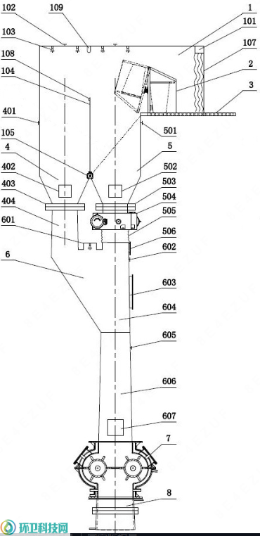 本实用新型公开了一种医疗废物等离子体气化炉和焚烧炉自动化前处理系统,包括分类预处理系统、上料系统、送料平台、料仓、对辊进料机与水冷通道,上料系统安装于送料平台末端上方,分类预处理系统安装于送料平台尾部处,分类预处理系统下方安装有并列设置的破碎进料系统与非破碎进料系统,破碎进料系统靠近上料系统,料仓上方与破碎进料系统与非破碎进料系统的底部出口连通,对辊进料机与料仓底部连通,水冷通道与料仓底部连通。本实用新型的优点在于可以实现全自动化连续稳定的进料,解决了人工上料的安全问题,一般等径料仓进料卡料问题、对辊进料机缠绕物料问题及密封不良问题。