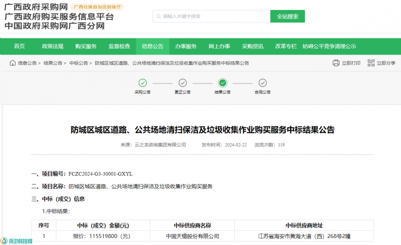 环卫科技网讯,2月22日,广西防城港市防城区城区道路、公共场地清扫保洁及垃圾收集作业购买服务中标结果发布,中国天楹股份有限公司中标,中标金额约1.16亿元(115519800元),服务期3年。