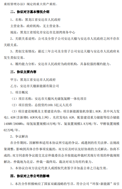 公告称,为充分利用安达市丰富的风、光资源,发挥中国天楹在新能源领域综合开发建设方面的领先优势,公司全资子公司安达市天楹新能源有限公司(简称“安达天楹”或“乙方”)与黑龙江省安达市人民政府(简称“甲方”)经友好协商,共同签署《风光储氢氨醇一体化项目投资合作协议书》。