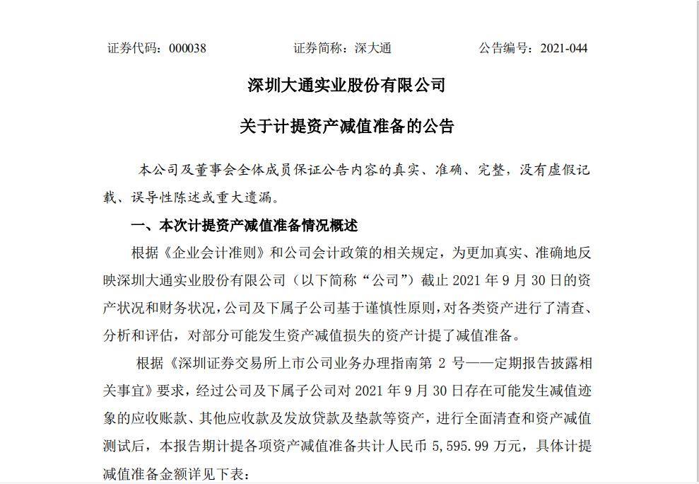 截止2021 年9 月30 日,深圳大通实业股份有限公司经过对2021年9月30日存在可能发生减值迹象的应收账款、其他应收款及发放贷款及垫款等资产,进行全面清查和资产减值测试后,本报告期计提各项资产减值准备共计人民币5,595.99万元。该减值计提将减少 2021 年 1-9 月公司利润总额 5,595.99 万元,相应减少公司所有者权益5,595.99 万元。
