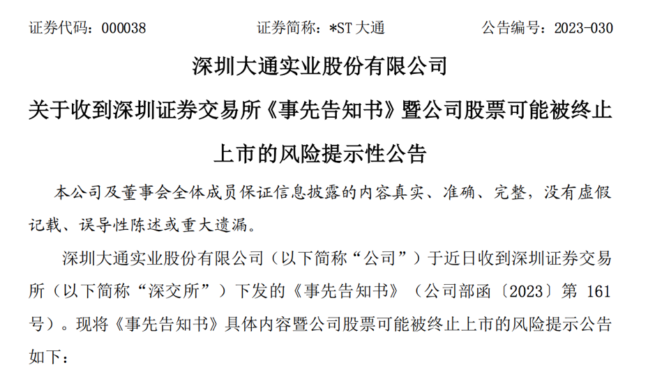 今年5月,*ST大通发布公告称,公司收到深交所下发的《事先告知书》,截至4月30日,公司未能在法定期限内披露2022年年度报告,触及深交所规定的股票终止上市情形,深交所拟决定终止公司股票上市交易。