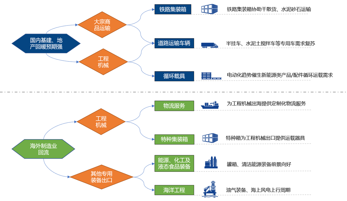 海外制造业回流,而中国工程机械海外市占率显著提升,也反映出中国制造正凭借过硬的品质和技术在全球市场中站稳脚跟。除了与机械工程相关的产品和服务与外部环境共振之外,中集能化板块、海洋工程装备也受益于海外市场复苏,出口需求持续向上。