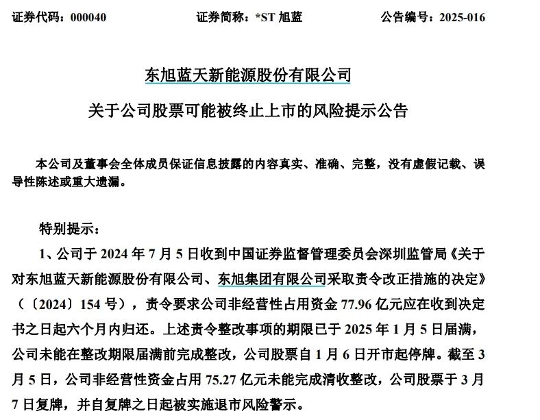 监管要求公司在六个月内归还非经营性占用资金77.96亿元。然而,到2025年1月5日整改期限届满时,公司未能完成整改,股票自1月6日起停牌。截至3月5日,仍有75.27亿元非经营性资金未完成清收整改,3月7日股票复牌后便被实施退市风险警示。