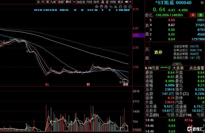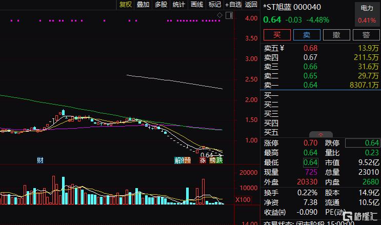截至3月24日,*ST旭蓝(000040)股价已连续15个交易日收于1元以下,最新收盘价报0.64元/股。