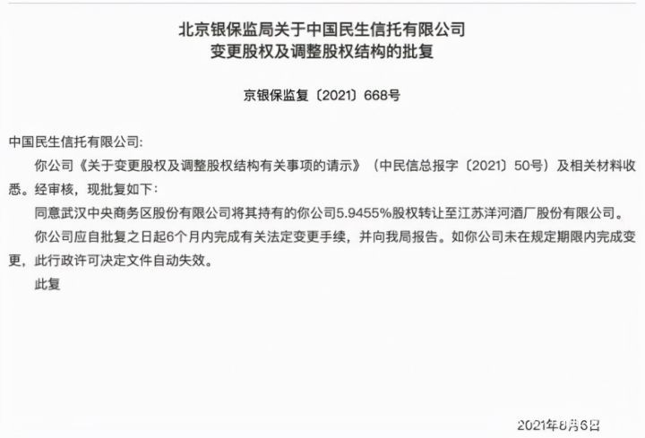 8月10日,北京银保监局对民生信托变更股权及调整股权结构一事作出了批复,同意武汉中央商务区股份有限公司将其持有的民生信托5.9455%股权转让至洋河股份。
