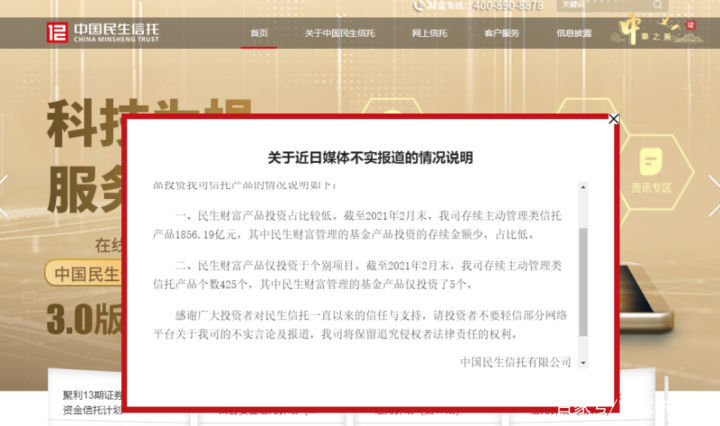 民生信托表示,“民生财富产品投资占比较低,且仅投资于个别项目”。公司方面披露的数据显示,截至2021年2月末,公司存续主动管理类信托产品共425个,价值1856.19亿元,其中民生财富管理的基金产品投资了5个,且“投资的存续金额少,占比低”。不过,民生信托并未披露民生财富投资的具体金额数目。