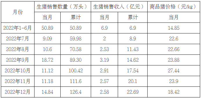 2022年1-12月,公司累计销售生猪126.44万头(其中仔猪25.67万头),累计销售收入22.69亿元;商品猪销售均价19.71元/kg。