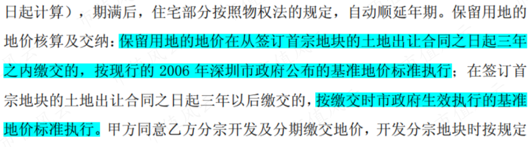 而最大的红利还不是土储,而是价格:签订首宗地块的土地出让合同之日起3年内缴纳土地出让金的,按现行的2006年深圳市政府公布的基准地价标准执行。