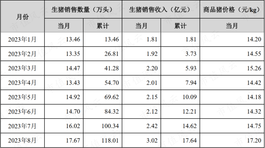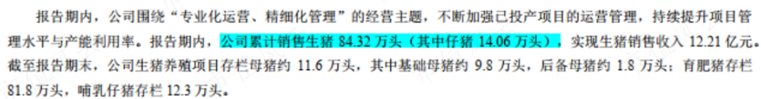 2023年上半年,累计销售生猪84.32万头,年末存栏母猪约11.6万头,育肥猪存栏81.8万头。