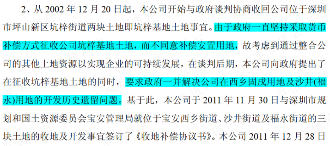 更大的土储红利发生在2011年,由于公司终于同意政府以货币方式征收坑梓基地土地,也一并解决了其西乡固戌用地及沙井(福永)用地的开发历史遗留问题。