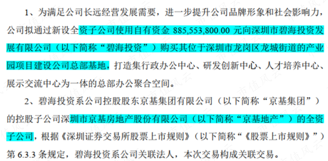 2022年12月7日,抢在年底前,京基智农公告拟使用8.86亿元自有资金购买京基地产全资子公司持有的产业园项目,用于打造总部基地。