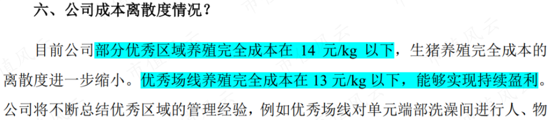 根据在投资者调研时的反馈,牧原股份部分优秀区域养殖完全成本在14元/kg以下,优秀场线养殖完全成本在13元/kg以下。