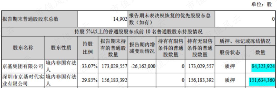 近4年21亿现金中,控股股东京基集团及其一致行动人京基实业共分得15.06亿。除此之外,京基集团及其一致行动人近年累计减持套现近10亿元,质押率也很高,超70%。