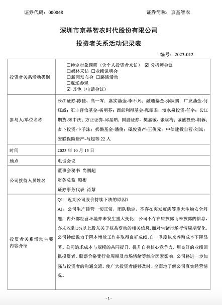 投资者询问,近期公司股价持续下跌的原因?京基智农答复:公司生产经营一切正常,团队稳定,不存在突发疫病等重大生物安全问题,内外部经营环境亦未发生重大变化;公司不存在应披露而未披露的信息,亦未收到5%以上股东关于权益变动的相关信息。面对生猪市场行情周期变化,公司持续致力于降本增效工作并取得良好成绩,自一季度以来养殖成本下降显著。公司追求成本与规模的共同提升,提升自身核心竞争力,用良好的业绩回报投资者。股票价格受行业周期及市场情绪等综合因素影响,公司将进一步加强与投资者的沟通交流,使广大投资者能够及时、全面地了解公司真实经营情况。