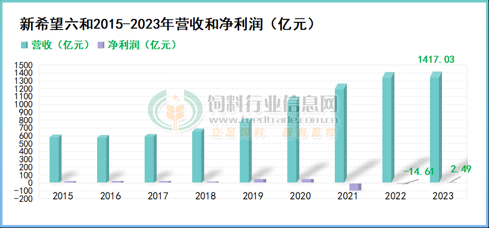 2023年新希望实现营业收入 1,417.03 亿元,同比增加 1.96 亿元,增幅为 0.14%;实现归属于上市公司股东的净利润 2.49 亿元,同比减亏 17.09 亿元,减亏幅度为 117.07%。