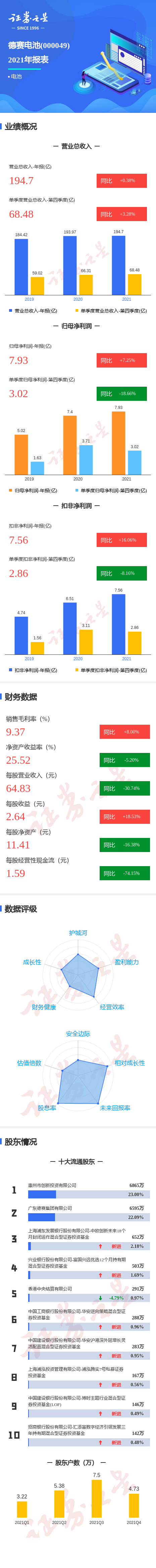 德赛电池2021年报显示,公司主营收入194.71亿元,同比上升0.38%;归母净利润7.94亿元,同比上升7.25%;扣非净利润7.56亿元,同比上升16.06%;其中2021年第四季度,公司单季度主营收入68.49亿元,同比上升3.28%;单季度归母净利润3.02亿元,同比下降18.66%;单季度扣非净利润2.86亿元,同比下降8.16%;负债率68.18%,投资收益681.71万元,财务费用2492.2万元,毛利率9.37%。