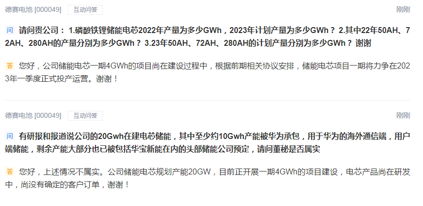 近日,有网友向德赛电池提问:有研报和报道说公司的20Gwh在建电芯储能,其中至少约10Gwh产能被华为承包,用于华为的海外通信端,用户端储能,剩余产能大部分也已被包括华宝新能在内的头部储能公司预定,请问董秘是否属实?