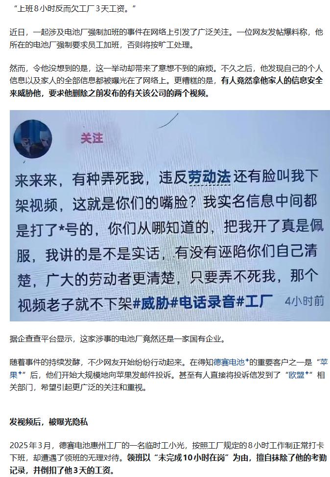 视频曝光后迅速在网络发酵,引发公众强烈关注。作为苹果、 华为 、OPPO等知名品牌的核心供应商, 德赛电池 的劳工管理问题不仅影响企业自身形象,更引发了对整个供应链劳工权益保障的质疑。据报道, 德赛电池 约一半营收来自苹果订单,而苹果公司对供应商劳工条件有严格要求,明确禁止"强迫劳动"。