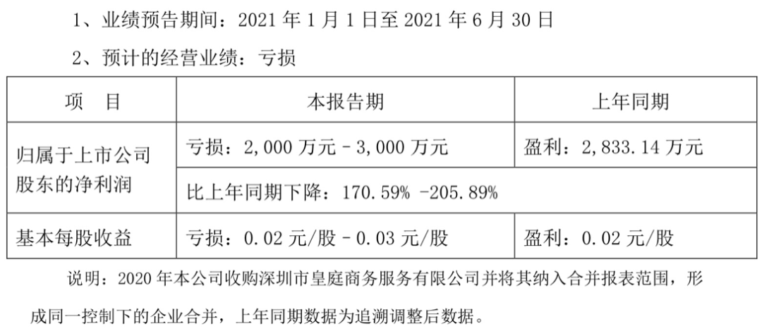 皇庭国际2021年半年度业绩预告显示,预计今年上半年实现归母净利润约为-2000万元至-3000万元,比上年同期下降170.59%至205.89%