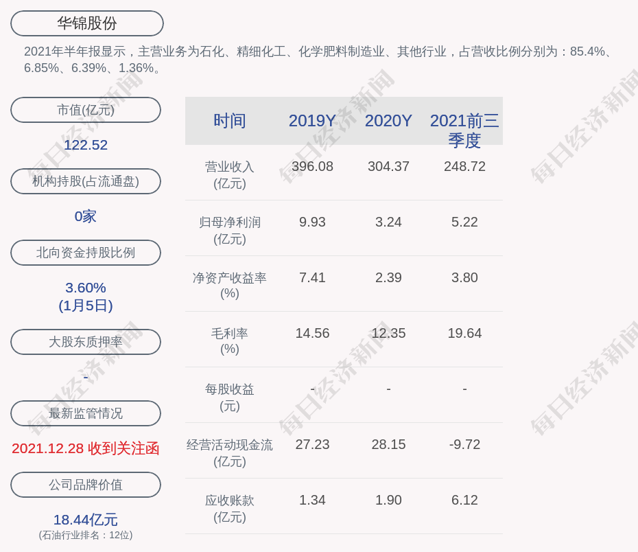 2021年半年报显示,华锦股份的主营业务为石化、精细化工、化学肥料制造业、其他行业,占营收比例分别为:85.4%、6.85%、6.39%、1.36%。