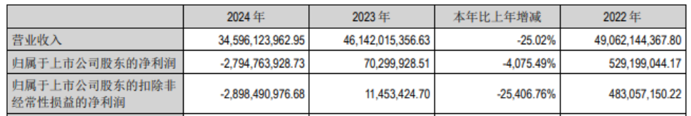 数据显示,公司全年营业收入为345.96亿元,同比大幅下降25.02%;归属于上市公司股东的净利润更是陷入巨亏状态,达到-27.95亿元,降幅竟达4075.49%。