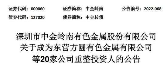 7月28日,中金岭南收到方圆等20家公司管理人发来的《中选通知书》显示,公司在方圆等20家公司的实质合并重整案重整投资人“选一备一”评选中胜出,成为方圆等20家公司的重整投资人。