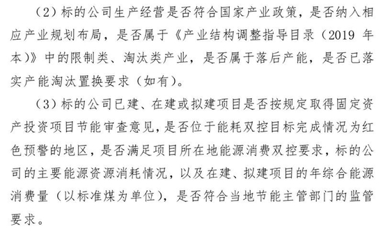比如,标的公司已建、在建或拟建项目,是否按规定取得固定资产投资项目节能审查意见、是否位于能耗双控目标完成情况为红色预警的地区、是否满足项目所在地能源消费双控要求。