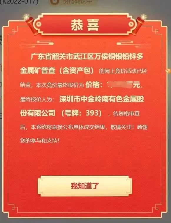受广东省自然资源厅委托,广州公共资源交易中心通过广州土地矿产网上交易系统挂牌出让广东省佛冈县迳头镇风迳金银矿普查等十一宗探矿权。深圳市中金岭南有色金属股份有限公司(以下简称“中金岭南”)近期通过竞价成功竞得广东省韶关市武江区万侯铜银铅锌多金属矿普查(以下简称“韶关万侯矿权”)和广东省阳春市尧垌铜多金属矿普查(以下简称“阳春尧垌矿权”)两个探矿权。其中韶关万侯矿权处于南岭成矿带一六矿田核心地段,成矿条件优越,在区内已发现中型以上钨、铅锌银矿床,并伴生有锂、铌钽矿等稀有金属。阳春尧垌矿权处于钦杭成矿带南西段阳春盆地西南缘,矿区与邻区大型石菉铜矿成矿条件相似,物化探异常明显并已发现品位较高的铜多金属矿化点,具有寻找大型矽卡岩型铜多金属矿床的找矿前景。