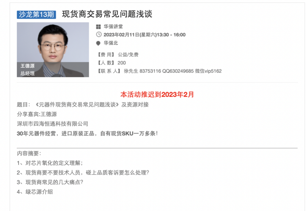 据课程简介显示,这并不是纯粹公益式的分享课。以将于2023年开设的课程“现货商交易常见问题浅谈”为例,该课程的主讲人是深圳市四海恒通科技有限公司(下称“四海恒通”)的总经理王德源,而该课程似乎也成为了四海恒通的广告位。