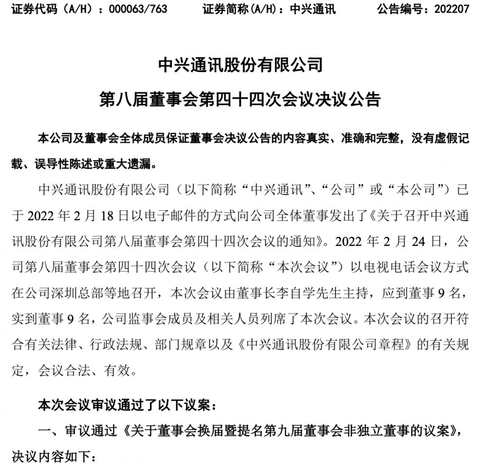 2月24日,中兴通讯召开第八届董事会第四十四次会议。会议审议通过《关于董事会换届暨提名第九届董事会非独立董事的议案》和《关于董事会换届暨提名第九届董事会独立非执行董事的议案》。