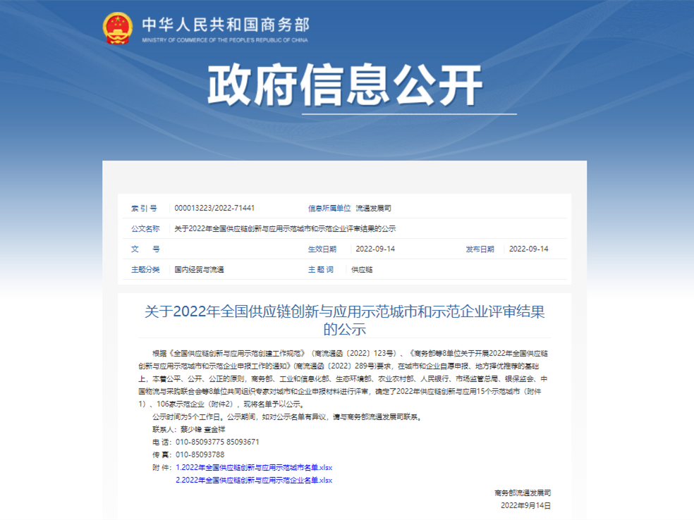 根据《全国供应链创新与应用示范创建工作规范》(商流通函〔2022〕123号)、《商务部等8单位关于开展2022年全国供应链创新与应用示范城市和示范企业申报工作的通知》(商流通函〔2022〕289号)要求,在城市和企业自愿申报、地方择优推荐的基础上,本着公平、公开、公正的原则,商务部、工业和信息化部、生态环境部、农业农村部、人民银行、市场监管总局、银保监会、中国物流与采购联合会8单位共同组织专家对城市和企业申报材料进行评审,确定示范城市和示范企业。