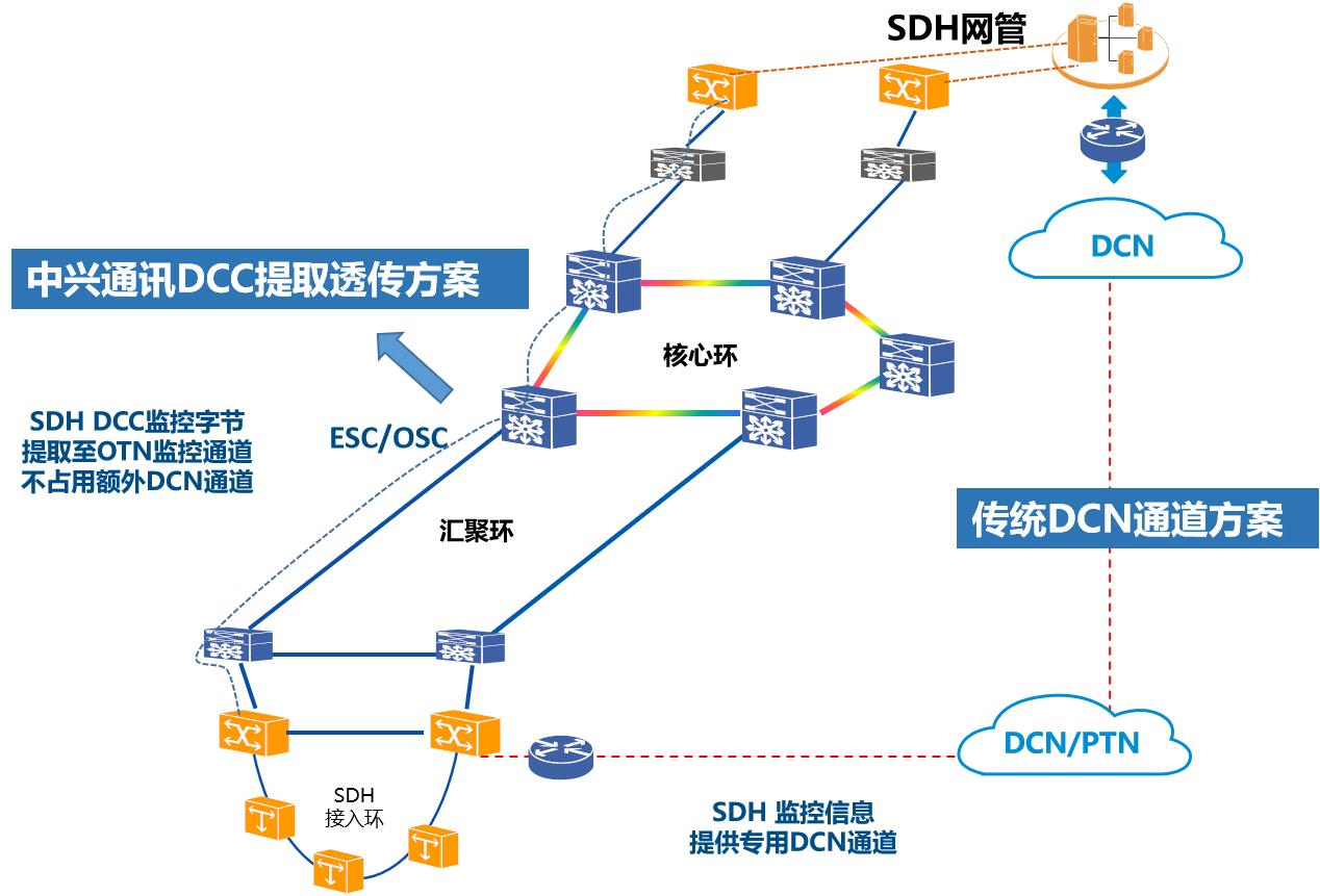 为解决以上问题,广东移动汕尾公司携手中兴通讯于2021Q4进行异厂家SDH设备DCC提取功能试点,并在近期完成业务割接,成功投入商用。在该项目中,中兴通讯创新性提出在VC-OTN与SDH设备对接节点上由VC-OTN设备对SDH设备的管理消息即DCC相关字节进行提取,然后通过智能OTN网络透明传输到部署在网管中心的VC-OTN设备,随后将该VC-OTN设备与第三方SDH设备做管理消息对接,最终该SDH设备解析管理消息后传输至网管系统中,并完成对SDH接入层设备管理消息的传递。
