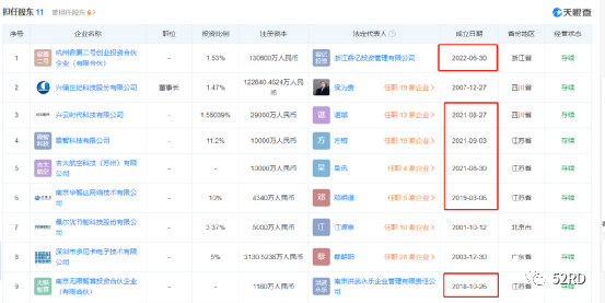 也是自动驾驶行业整体解决方案供应商英博超算南京(中兴通讯为最大股东)、航空公司(吉太航空科技(苏州))、人工智能机器人公司霞智科技、兴云时代科技有限公司(业务涵盖绿色云计算、生物质能源、海外棕榈等)等19家公司的股东,这些多成立在2016年之后。