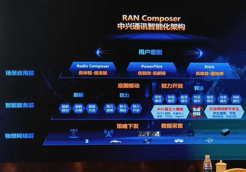 “最上层是场景应用层,中兴通讯针对用户体验、网络能效和运维效率分别推出解决方案。”Radio Composer运维方案能够提升用户体验,通过对特定用户的特定业务保障,促进网络流量的增长;ProwerPilot解决方案能够利用智能化的复合预测、感知预测、能耗预测和多样化节能的原子能力,在保障用户体验和网络性能的前提下,实现5G能效的显著提升;RNIA综合解决方案,利用AI对于故障的预测能力、对于问题的定位能力,以及对于治愈策略的智能生成能力,提升运维效率以及网络的可靠性和可用性。